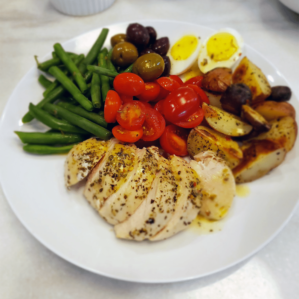 - If you’re making this for weekday lunches, assemble the salads in divided containers. Put the chicken, green beans and potatoes on one side and the tomatoes, olives and eggs on the other. Put 2 tbsp of the dressing in it’s own container.